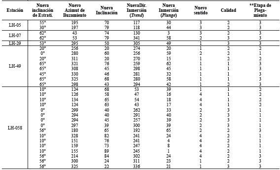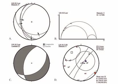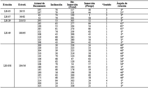 En la Tabla 4 se observa el resultado del análisis puntual preliminar de los datos correspondientes a la estación LH18 y en la Tabla S2 se muestra para las demás estaciones con datos de estrías. Cabe aclarar que los datos de pitch fueron convertidos a datos de inmersión y dirección de inmersión (plunge y trend) utilizando la plantilla estereográfica de Schmidt (Cetina y Patiño, 2013).