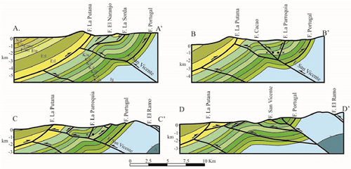 La zona de estudio está dividida por fallas transversales que actúan como rampas laterales (Figura 8A) de las fallas longitudinales (Figuras 2 y 6). Estas fallas transversales segmentan la zona en tres bloques (sur, centro y norte) que se comportan de manera diferencial.
