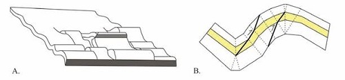 El bloque norte es afectado en profundidad por la Falla San Vicente y cerca de la superficie por fallas que presentan características de propagación mixta, ya que éstas son derivadas de la falla principal, pero su comportamiento es influenciado por el desarrollo de los pliegues menores, actuando como fallas secundarias (Figuras 7A y 8B). El bloque centro está más levantado estructuralmente respecto al bloque norte y está limitado por la Falla Pujamanes (Figuras 2 y 6).