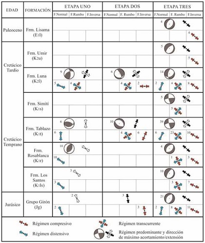 La etapa uno representa una fase de distensión y transcurrencia a final del Mesozoico, la segunda etapa se asocia al inicio de la deformación por compresión y la tercera etapa refleja la fase reciente responsable de la configuración actual. Cabe resaltar que estos tensores se encontraron en las diferentes unidades geológicas que presentan planos estriados (Figura 9) y por lo tanto, reflejan estas etapas, pero no excluyen otras posibles fases de deformación.