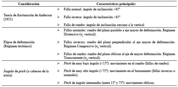 Los datos de estrías de falla fueron analizados bajo la premisa de que estos planos pueden reflejar eventos de deformación sobreimpuestos, a pesar de la continuidad estructural del área. Por eso se planteó un método que permite determinar la relación genética que existe entre los planos de falla y la evolución de la deformación del AY, reflejada en la estratificación de las unidades que lo componen (Cetina y Patiño, 2013). Para ello, primero se llevó a cabo un análisis puntual preliminar de cada plano de estría de falla, con el objetivo de observar si cada dato cumple con condiciones de generación mecánicamente posibles o sufrió modificaciones por superposición de eventos. El análisis puntual consistió en observar si los datos se acercaban o no las siguientes consideraciones: i) cumplimiento de la teoría de fracturación de Anderson (1951); ii) relaciones angulares ideales entre las estructuras (planos de fallas) según la elipse de deformación, indicando además régimen tectónico propicio; y iii) dato de pitch (o cabeceo de la estría) (Tabla 1). A partir de este análisis se discriminaron de manera preliminar los planos de falla con modificación en su actitud por eventos de deformación sobreimpuestos, a los cuales, posteriormente, se les aplicó la técnica de rotación de planos para identificar sus condiciones ideales de formación.