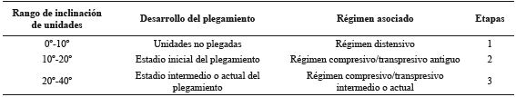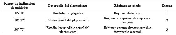 Posteriormente, a partir del grado de rotación efectuado sobre la estratificación de las unidades (en donde están contenidos los planos de falla), se establecieron tres etapas de evolución del AY. Esto debido a que el grado de inclinación de los estratos se relaciona con las etapas de desarrollo del pliegue y con un régimen tectónico asociado. Para ello, se definieron rangos en dos conjuntos según la inclinación actual de las unidades (Tabla 2 y 3), ya que se presentan diferencias marcadas en la actitud de los estratos debido a: i) la deformación diferencial que se presenta en la estructura, y ii) a la localización estructural y estratigráfica de cada formación. En ese sentido, estratos con inclinaciones actuales de hasta de 40° se agruparon en rangos de inclinación de 0° a 10°, 10° a 20°, y 20° a 40° (Tabla 2), y unidades con inclinaciones actuales mayores a 40° y hasta 75° (que corresponde a la máxima inclinación de estratos medidos en campo) se agruparon en rangos de inclinación de 0° a 10°, 10° a 30°, y 30° a 75° (Tabla 3). Estos rangos de inclinación hacen referencia a la estratificación de las unidades obtenida después de aplicar la rotación, que para los datos no rotados serán las inclinaciones medidas en campo. De este modo, los estratos que al rotarse quedaron con inclinaciones de 0° a 10° se asignaron a una primera etapa (etapa 1), caracterizada por estratos no plegados o levemente basculados asociados a un régimen distensivo; las unidades con inclinaciones de 10° a 20° o de 10° a 30° (según el caso) se asignaron a una segunda fase (etapa 2), como reflejo de un estadio inicial del plegamiento asociado a un régimen compresivo-transpresivo antiguo; y las unidades con inclinaciones de 20° a 40° o de 30° a 75° se asignaron a una tercera fase (etapa 3), atribuida a un estadio intermedio-actual del plegamiento y asociado a un régimen compresivo-transpresivo. Cada dato de estría fue agrupado en alguna etapa del plegamiento, según el grado de rotación aplicado (Tabla S2).