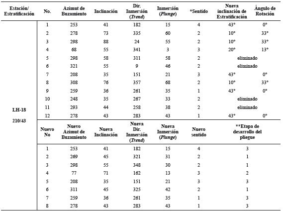 Cabe aclarar que sólo se aplicó la técnica de rotación de planos respecto a un eje horizontal (estratificación), sin considerar rotación con un eje inclinado, que correspondería al cabeceo del anticlinorio, esto por tratarse de una estructura regional que conserva su rumbo por varios kilómetros. Además, la diferencia promedio del rumbo de las capas no es mayor a 15° y la mayor variación está asociada a efecto de estructuras locales.