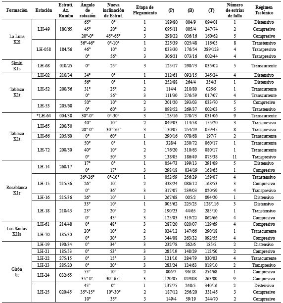 El proceso descrito para cada una de las estaciones, se efectuó también agrupando los datos por formaciones geológicas. Esto con el propósito de analizar las variaciones de los tensores (o paleotensores) a través del tiempo geológico. Como ejemplo, en la Tabla 5 se muestra el resultado de rotación de los datos correspondientes a la Formación La Luna y su agrupación según las etapas del pliegue establecidas.