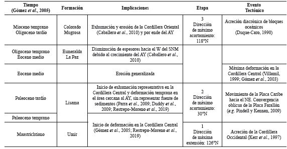 Diversos trabajos en las últimas décadas han propuesto la temporalidad de los pulsos de deformación de los Andes del Norte en Colombia. Los eventos de compresión-transpresión en el territorio colombiano inician con la acreción oblicua de terrenos de afinidad oceánica durante el Cretácico-Paleoceno temprano (e.g.Villagómez et al., 2011), (Hincapié-Gómez et al., 2018), lo que contribuyó al inicio de la exhumación de la Cordillera Central, evento marcado en edades de trazas de fisión en circón de ~78 Ma (Parra et al., 2009). Posteriormente, la Cordillera Central registra dos eventos de exhumación durante el Eoceno tempranomedio y Oligoceno temprano-Mioceno, así como un evento de calentamiento en el Mioceno tardío-Plioceno tardío, indicado por edades (U-Th)/He en apatito (recopilación en Restrepo-Moreno et al., 2019). Nie et al. (2012) sugieren que el levantamiento inicial de la Cordillera Central se produjo en el Paleoceno medio y que se constituyó en fuente de sedimentos importante para la Cuenca del VMM desde el Paleoceno tardío al Eoceno temprano.