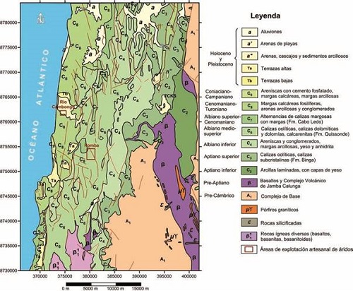 Las formaciones sedimentarias del Holoceno y Pleistoceno yacen discordantemente sobre las formaciones cretácicas más recientes. Estas se encuentran depositadas sobre la plataforma pleistocénica en las proximidades de la zona litoral, formando las denominadas terrazas bajas (Tb) y terrazas altas (Ta). También se describen mantos de arenas de playas no consolidadas (a’), cubriendo depósitos aluviales representados por arenas, cascajos y sedimentos arcillosos. Aluviones representados por depósitos de arena cuarzosa se encuentran en la zona litoral y hacia el interior, vinculados a zonas de deposición fluvial.