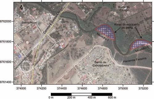 El área de explotación de arenas se localiza en la margen izquierda del curso bajo del río Cambongo, en la zona acumulativa asociada a varios meandros dentro de su llanura aluvial. Esta es colindante con barrios periféricos de la ciudad de Sumbe y limita al norte con Chingo, al sur con Kissala y Cabouqueiro, al oeste con Bairro Novo y al este con Pindo (Figura 3).