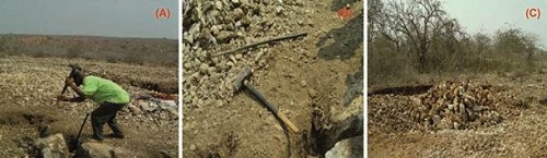 Las labores de excavación y fracturación de rocas son realizadas de manera desordenada por personas no preparadas para este tipo de actividad, provocando desniveles en el terreno, representados por zanjas y oquedades (Figura 6A).