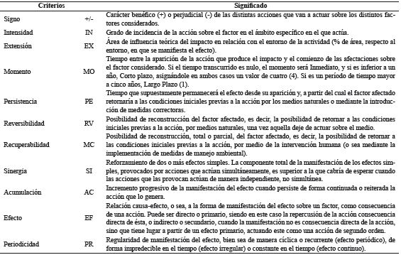 Conesa (1995) propone varios criterios de evaluación de los impactos ambientales, a los que se les asignan categorías en correspondencia con sus niveles de influencia. Estos incluyen: signo (+/-), intensidad (IN), extensión (EX), momento (MO), persistencia (PE), reversibilidad (RV), recuperabilidad (MC), sinergia (SI), acumulación (AC), efecto (EF) y periodicidad (PR) (Tabla 1).