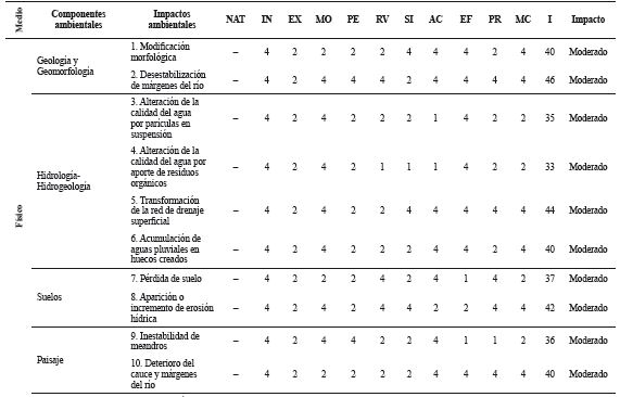 La evaluación de estos impactos ambientales se expresa mediante la aplicación de la matriz de Conesa (1995) (Tabla 3).