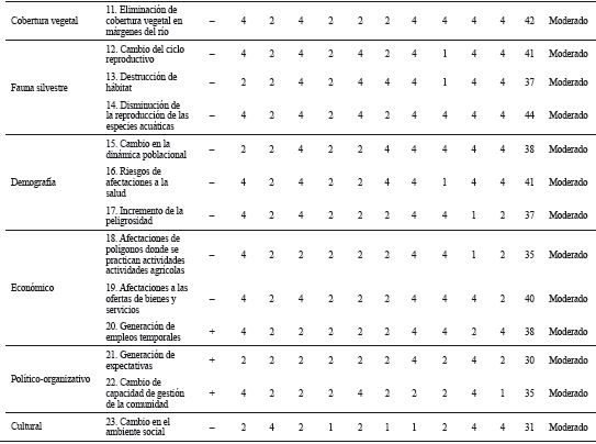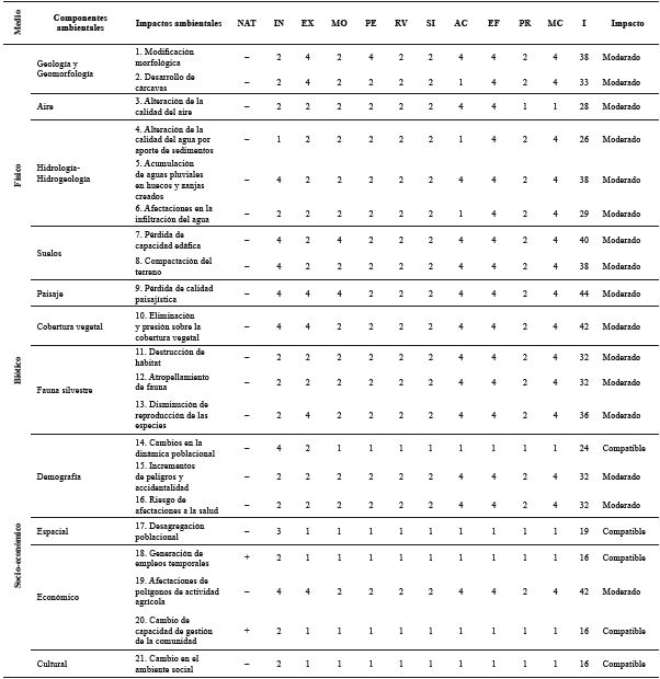 Del análisis de los resultados mostrados en esta tabla se puede apreciar que los impactos negativos superan en importancia a los impactos positivos. Además, la totalidad de los impactos son clasificados como moderados.