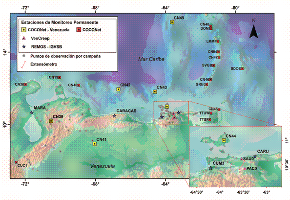 La geodinámica ligada al territorio venezolano ha sido estudiada por casi tres décadas con el uso de mediciones geodésicas precisas con el Sistema de Navegación Global por Satélite (Global Navigation Satellite System - GNSS). Las mediciones llevadas a cabo en las diferentes iniciativas en suelo venezolano han seguido la metodología de adquisición de datos por ocupaciones temporales o comúnmente conocidas como campañas (Drewes et al., 1989, 1995; Kellogg y Dixon, 1990; Pérez et al., 2001a, 2001b, 2011; Baumbach et al., 2004; Jouanne et al., 2011; Reinoza, 2014; Reinoza et al., 2015). Básicamente, la adquisición de los datos ha consistido en la instalación temporal de receptores geodésicos doble frecuencia en sitios predeterminados, durante periodos de unas pocas horas en varias sesiones diarias hasta un máximo de 120 horas continuas de medición, e incluso, algunos puntos han sido seleccionados como estaciones base. Un ejemplo, es la estación AUD0 que fue utilizada como estación permanente durante las campañas de medición 2003, 2005 y 2013 en el nororiente de Venezuela. Desde un punto de vista muy general, los datos geodésicos han permitido determinar el campo de velocidades geodésicas para gran parte del país y determinar tasas de movimiento de fallas geológicas (e.g. fallas de Boconó y El Pilar), así como contribuir en el cálculo del desplazamiento relativo entre las placas Caribe y Suramérica (DeMets et al., 2000; Pérez et al., 2001a, 2001b). No obstante, la poca densidad de estaciones a lo largo del territorio ha limitado los resultados, la velocidad de las fallas no ha sido acotada en toda su extensión y los parámetros estimados en estudios previos presentan ciertas incertidumbres que requieren ser mejor definidos con nuevos datos geodésicos (Pérez et al., 2011, 2018; Jouanne et al., 2011; Reinoza et al., 2015; Mogollón y Reinoza, 2018). Además, existe un número importante de fallas que aún no han sido objeto de estudio aplicando técnicas de geodesia espacial. Para el estudio de la cinemática de fallas en Venezuela las recopilaciones basadas en neo-tectónica, paleosismología, sismología entre otras disciplinas (e.g.Audemard et al., 2000) siguen siendo la principal fuente de consulta.