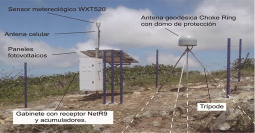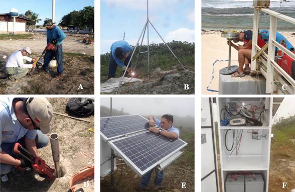 La instalación de una estación tipo CN44 sigue los pasos que se describen a continuación: (1) previo a la instalación de la estación se realiza una minuciosa revisión de los equipos, materiales y herramientas a ser utilizados. Se realizan las pruebas y configuración final del receptor NetR9 y la antena Choke Ring de la marca Trimble. (2) En algunos casos se hace necesario la solicitud de permisos. En lo que respecta a la estación CN44, meses antes se había adelantado la documentación correspondiente ante el Instituto Nacional de Parques (INPARQUES). Y en el caso de las estaciones a instalar en islas del TIFM, semanas o meses antes se planifica la logística de transporte con la Armada Nacional Bolivariana de Venezuela. (3) Ya en el sitio pre-seleccionado, se realiza una revisión y selección del emplazamiento final para la construcción del monumento con base en línea de vista clara hacia los satélites GNSS, así como de las unidades de alimentación de energía y comunicaciones. (4) Se toma la orientación del norte magnético como punto de partida para la ubicación de la antena geodésica y la disposición de las celdas solares con el fin de optimizar su rendimiento. (5) El punto medio del SBDM es seleccionado y se ejecuta la perforación del hoyo central para el emplazamiento de la pata vertical. Después de finalizar la perforación del hoyo central, se selecciona el punto de instalación de la pata orientada hacia el norte (aproximadamente 1 metro desde el punto central) y se inicia la perforación considerando un ángulo de 55° con el plano horizontal del suelo. La posición y dirección de las patas varía si la topografía del emplazamiento no es sub-horizontal; ajustándose a la topografía. (6) Este proceso se repite con las otras dos patas restantes, asegurándose que estén espaciadas en 120° a partir de la pata de orientación norte. Al final de la perforación, las barras se cementan al sustrato rocoso, se calcula la disposición final y se procede a cortar el material sobrante de las barras; y de esta forma son soldadas las barras inclinadas contra la pata central, para ser finalmente reforzadas con piezas anguladas de acero inoxidable entre las barras inclinadas y la central vertical, dándole la forma, solidez, rigidez, estabilidad y fortaleza al “tetrápodo”. (7) Posteriormente, se suelda una terminación enroscada sobre el tope de la barra central para colocar el adaptador de la antena, y se procede a instalar y nivelar la antena Choke Ring orientada al norte. (8) Adicionalmente, en proximidad (a unos pocos metros) y evitando generar interferencias a la antena geodésica con reflexiones sobre las superficies planas de los paneles solares, se realiza la perforación y cementado del mástil o poste para la ubicación de la unidad de alimentación y comunicación. (9) Luego, se procede al montaje del gabinete (Serie F de la casa SunWize) que contendrá el receptor NetR9 y los acumuladores del sistema de alimentación solar. (10) Se montan las dos celdas solares de 85 vatios orientadas longitudinalmente E-W e inclinadas ligeramente (unos 10°-15°) hacia el sur, buscando el máximo aprovechamiento de los rayos solares del sol siempre ubicado levemente al sur por encontrarnos en las bajas latitudes norte (0°-16°N). (11) Se realiza la conexión del cable entre la antena y el gabinete, así como la instalación de dos baterías de 90 Amh, se termina el cableado eléctrico, las protecciones eléctricas ante un corto circuito y el poste base a tierra. (12) Finalmente, se realiza la configuración del receptor NetR9, del modem celular y el sensor meteorológico WXT520, que registra datos de presión del aire, temperatura, humedad, precipitación, velocidad y dirección del viento. De acuerdo a las condiciones del sitio, pudiese ser conveniente realizar trabajos de protección de las instalaciones contra vandalismo, incursión de animales, etc. En la Figura 4 se ilustran algunos pasos de la metodología de instalación.
