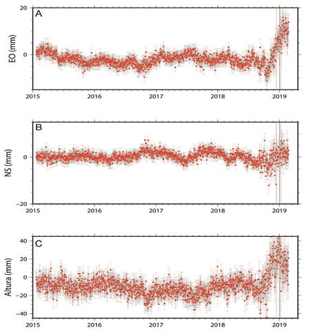 Los datos de las estaciones COCONet en territorio venezolano se encuentran actualmente disponibles en el DAI Version 2. En esta plataforma adicionalmente se puede obtener información sobre la descripción del sitio y monumento, estadísticas de control de calidad de los datos, información sobre la última configuración, series de tiempo geodésicas (Figura 6) y aspectos complementarios. La metodología para el análisis de los datos y generación de productos geodésicos son ampliamente descritos por Herring et al. (2016). Como se predice en dicho trabajo, el ITRF2008/ IGb08 (Altamimi et al., 2012) ha sido reemplazado por el ITRF2014/IGS2014 (Altamimi et al., 2017) como principal marco de referencia. Actualmente, el centro de procesamiento GAGE ofrece valores de posición, series de tiempo y velocidades en el marco de referencia IGS2014, una interpretación específica del IGS para el ITRF2014 que incluye nuevas y actualizadas calibraciones de los satélites, antenas y receptores GNSS. Adicionalmente, se incluyen resultados en los marcos de referencia Norte América (NAM14) y Antártica (ANT14), estos dos últimos basados en las estimaciones de posición utilizando el vector de rotación de (Altamimi et al. 2017). De igual forma, se sigue generando resultados en los marcos de referencia IGS08 y NAM08 (Altamimi et al., 2012). Entre los resultados resaltantes para estaciones en territorio venezolano, es el trabajo de Wang et al. (2019) que incluye los datos de las estaciones CN39, CN41 y CN49 como parte de un total de 250 estaciones geodésicas continuas con el propósito de desarrollar un marco de referencia estable para el Caribe (CARIB18).