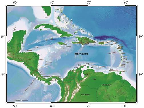 Pérez, O.J.; Bilham, R.; Bendick, R.; Velandia, J.R.; Hernández, N.; Moncayo, C.; Hoyer, M.; Kozuch, M. (2001b). Velocity field across the Southern Caribbean Plate Boundary and estimates of Caribbean/South-American Plate Motion using GPS Geodesy 1994-2000. Geophysical Research Letters, 28(15), 2987-2990. doi: 10.1029/2001GL013183