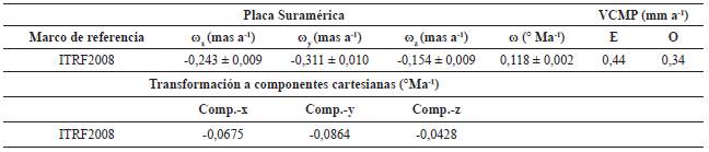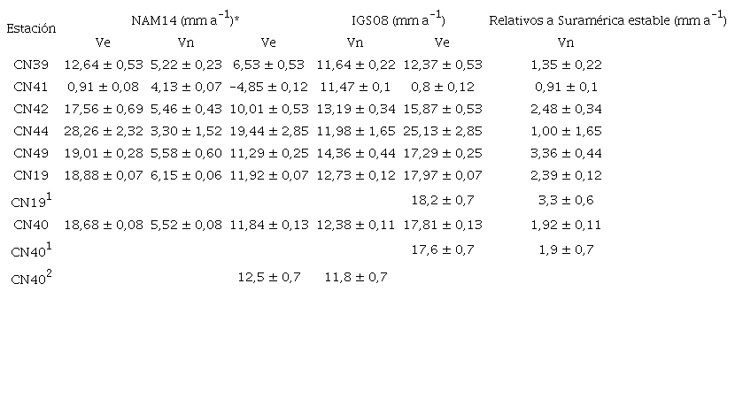 Con el propósito de comparar y validar los resultados de las estaciones instaladas en Venezuela con las estaciones más próximas, calculamos las velocidades relativas a Suramérica estable para todo el conjunto de estaciones COCONet (Figura 7) a partir de los datos de velocidad en el marco de referencia IGS08 generados por el centro de procesamiento GAGE, utilizando el polo de rotación absoluto propuesto por (Altamimi et al. 2012) (Tabla 2). Se descartaron los valores de las estaciones BIS0, MARC, PRMO y CN56, por presentar errores considerables en sus resultados. Se observa que las estaciones CN39, CN41, CN42 y CN49 muestran magnitud y orientación coherente.