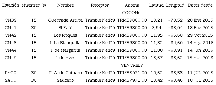 La red COCONet fue impulsada con el propósito de desarrollar una infraestructura geodésica y atmosférica de gran escala en el Caribe (Braun et al., 2012). El objetivo principal de esta red es ser la columna vertebral para una amplia gama de investigaciones (e.g.Anthes et al., 2015; Braun et al., 2017), así como responder interrogantes relevantes en materia de geo-amenazas (e.g.Pérez et al., 2018; Ellis et al., 2018, 2019). La red está compuesta de 145 estaciones, subdividas en: (1) 57 estaciones COCONetCore que incluyen todos los sitios que el Consorcio Universidad NAVSTAR (University NAVSTAR Consortium - UNAVCO) ha instalado y mantiene actualmente, (2) 25 estaciones repotenciadas (COCONetRefurb) que incluyen todos los sitios operados por instituciones colaboradoras (University Corporation for Atmospheric Research - UCAR; Geomedición, Instrumentos y Sistemas, S.R.L. de República Dominicana; Universidad Nacional de Costa Rica, Gobierno de Islas Cayman, entre muchas otras), en donde UNAVCO ha provisto insumos para actualizar los equipos y actualmente financia operaciones y mantenimiento, y por último (3) 63 estaciones operadas (COCONetPartner) por instituciones aliadas con acceso abierto y gratis a toda la comunidad geodésica global.