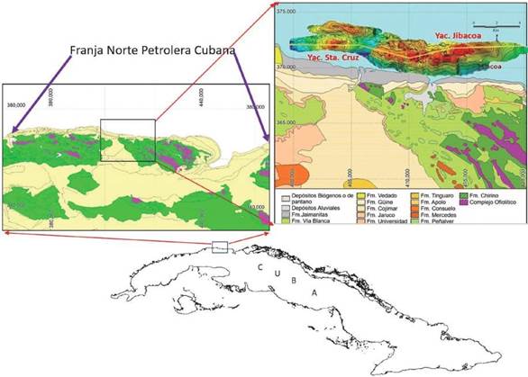 El estudio se realizó en las áreas de los yacimientos Santa Cruz del Norte (tomado como patrón de aprendizajepredictivo) y Jibacoa (patrón predictivo), que se encuentran en la FNPC, principal zona productora de hidrocarburos de la República de Cuba (Figura 1). Como objetivo de trabajo se utilizó la controvertida Formación Vega Alta, considerada oficialmente como el sello regional de la FNPC. Esta es una secuencia sinorogénica que corresponde a depósitos de la cuenca de antepaís en profundidades batiales de edad Paleoceno-Eoceno Inferior. Está constituida por depósitos caóticos policomponentes que contienen bloques y fragmentos de calizas de diferentes edades, serpentinitas, rocas volcánicas y brechas. En la base se observan depósitos turbidíticos distales. Una breve caracterización lito-paleontológica determina que la conforman cuatro facies principales: a) facies arcillosa con clastos conglomeráticos (olistostromas); b) facies conglomerática arcillosa-arenosa; c) facies arcillosa silícea y d) facies arcillosa-carbonatada. En muchos intervalos se producen significativas manifestaciones de petróleo y gas, pero no deben olvidarse las limitadas posibilidades productivas que tienen estas secuencias, debido a la abundante matriz arcillosa que las caracteriza (Morales, 2014). Se instrumentó una metodología de trabajo consistente en tareas de recopilación, transformación, evaluación e interpretación de datos.