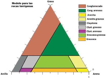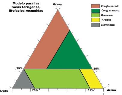 Modelo ternario para las rocas clásticas que generaron 5 litofacies (Figura 11).
