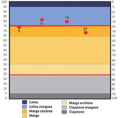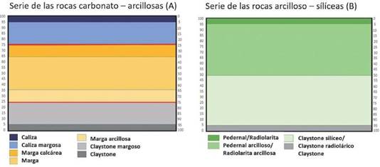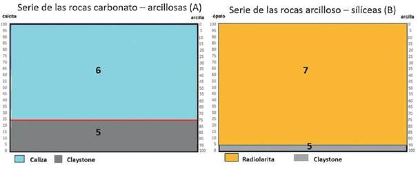 Para la clasificación de las microfacies carbonatadas arcillosas y arcillosas silíceas de grano fino, se compuso un modelo de doble entrada. Los componentes que se toman en cuenta son arcilla y ópalo (el principal es el componente silíceo, proveniente de los radiolarios). En el caso de las litofacies calcáreas se toma en cuenta el componente calcáreo (calcita) y su mezcla con arcilla (Figura 6).