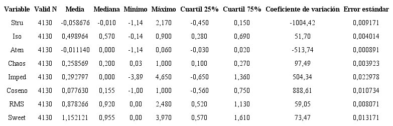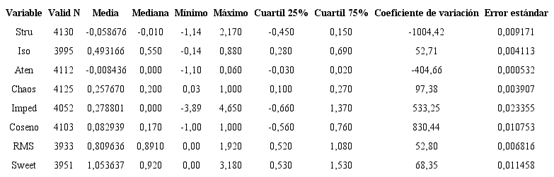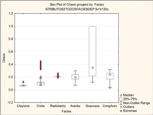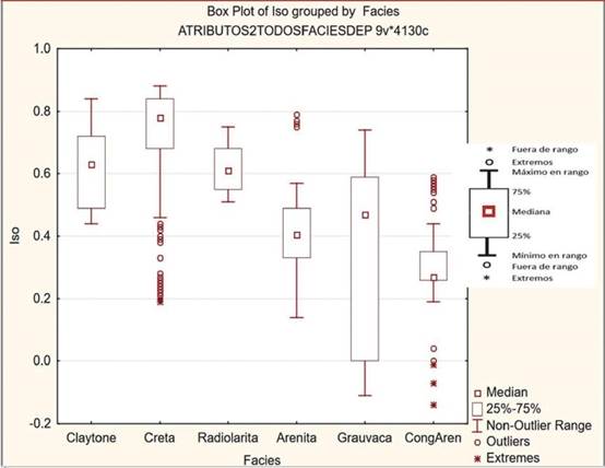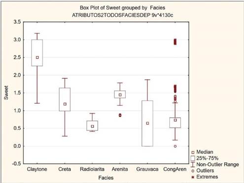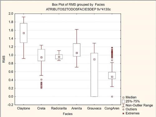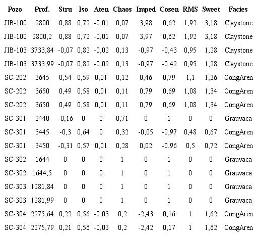 En la Tabla 2 se muestra un análisis estadístico preliminar de los valores de los atributos. Con esa información se procedió a la depuración de la base de datos, de valores extremos o fuera de rango (outliers) y se pudo determinar de forma preliminar cuáles son los atributos sísmicos capaces de diferenciar en mayor o menor grado las litofacies (Tabla 3).