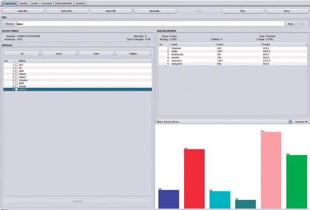 Con esta información previa sobre el comportamiento de los atributos se puede pasar a la etapa de la utilización de metodologías multivariadas y clasificación supervisada. Se utilizó el software Weka 3.9.3 (Weka, 2008), que se define como una colección de algoritmos de aprendizaje por computadora (en librerías JAVA), para tareas de minería de datos y que contiene herramientas para la preparación, clasificación regresión, agrupamiento, reglas de asociación y visualización de datos.