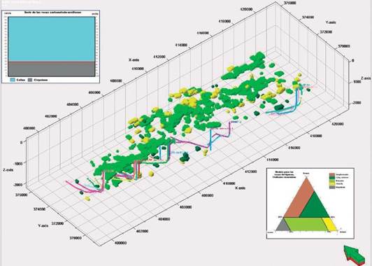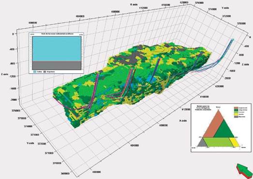 Para disminuir en cierta medida la entropía presente entre las litofacies y homogeneizar el modelo, a la matriz con dimensión de celdas de 50m x 50m x 50m, se le aplicó un filtro de promedios móviles (para el cálculo de la probabilidad de pertenencia a cada facies), resultando una nueva matriz con celdas de 250m x 250m x 50m. Ya con las probabilidades calculadas por cada celda, se realizó una nueva depuración que incluye solamente aquellas celdas con un valor de pertenencia de similitud (probabilidad) con las litofacies patrones ≥ 70% (Figura 19), a partir del modelo litofacial de la Figura 18.