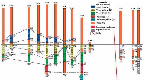 Como los pozos están dirigidos hacia los reservorios más profundos (carbonatos plegados del Grupo Veloz, en sus diferentes escamas yellow, green, red, blue y deep blue, de edad Jurásico Superior- Cretácico Inferior por debajo de la Formación Vega Alta), no están uniformemente distribuidos en el área (prácticamente alineados de oeste a este), haciendo que la información existente esté muy focalizada, como se puede observar en el yacimiento patrón Santa Cruz del Norte (Figura 4).
