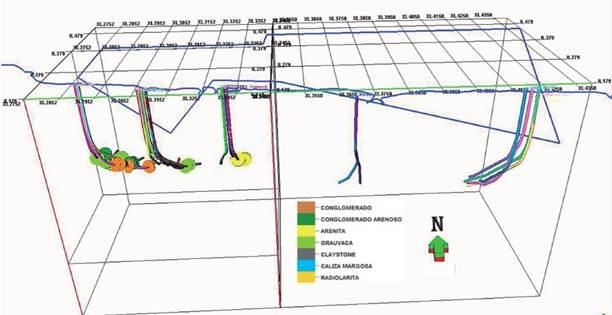 Se puede apreciar el predominio de las litofacies de grauvaca y en menor medida de las arenitas y conglomerados. Este comportamiento (aunque modelado) se acerca al concepto estudiado en el modelo de microfacies y corresponde a la tendencia de los procesos turbidíticos ocurridos.