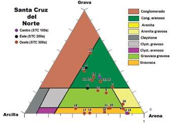 Se caracterizaron litofacialmente 45 intervalos seleccionados como posibles productores de gas, donde la mayoría de éstos pertenecen a la Formación Vega Alta. Para la determinación de las microfacies terrígenas de grano grueso y medio (gravas y arenas), fue creado un modelo ternario, con arcilla, grava y arena (Figura 5), el cual permite su clasificación con gran facilidad cuando se han determinado con anterioridad los porcentajes de cada componente.