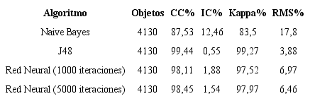 Para el trabajo con estos algoritmos se empleó la opción de trabajo de validación cruzada (crossvalidation), que calcula el porcentaje esperado de aciertos mediante una validación de k evaluaciones.