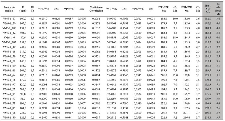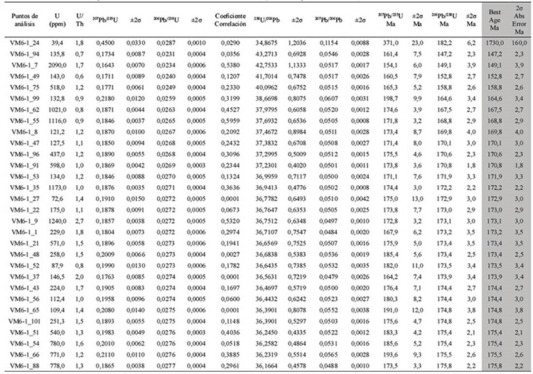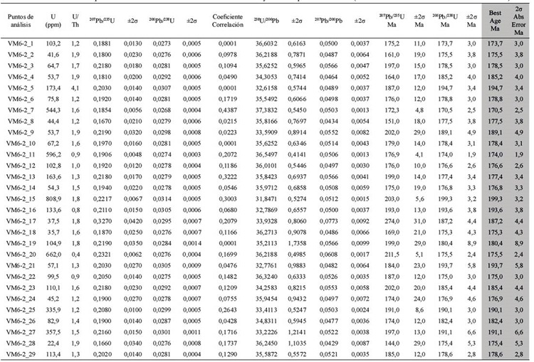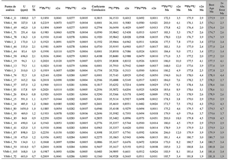 En la muestra VM6-1 analizada, clasificada petrográficamente como un cuerpo ígneo sienogranito (Figura 4A y 4B), se realizaron un total de 82 análisis (Anexo 1), de las cuales se consideraron óptimas para la interpretación aquellas con discordancias inferiores al 10% (Spencer et al., 2016) y relaciones Th/U propias de circones ígneos entre 0,3 y 1,7 (Rubatto, 2002). La edad de concordia obtenida en esta muestra arroja un valor de 176,7±2,2 Ma (2σ) (Figura 6), la cual es interpretada como una edad de cristalización del cuerpo ígneo (edad Toarciense).