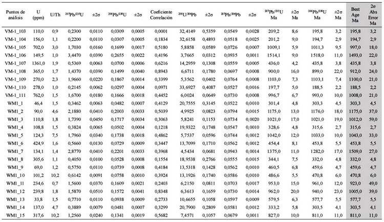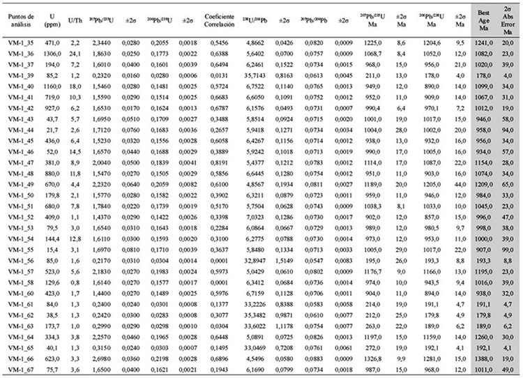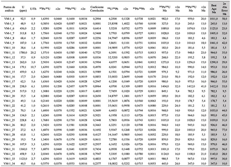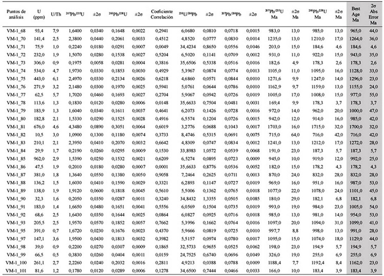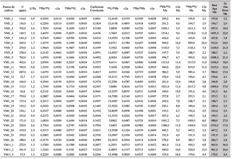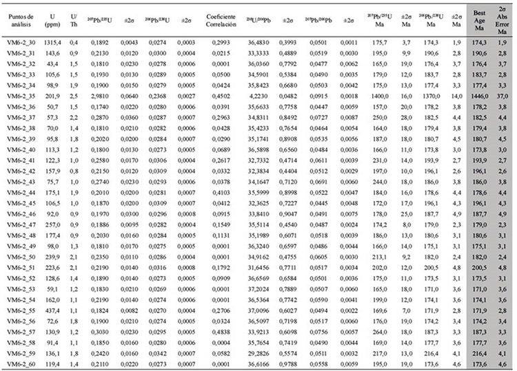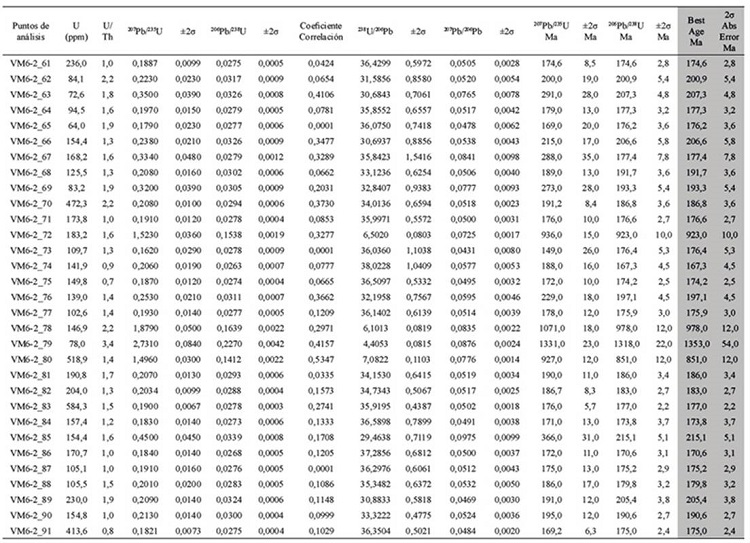 Los datos analíticos y las relaciones isotópicas U-Pb determinados en circones ígneos (Figura 5) y detríticos de las tres muestras analizadas mediante la técnica LA-ICP-MS (muestras VM1, VM6-1, VM6-2), se resumen en los Anexos 1, 2 y 3 y sus representaciones se proyectan en las Figuras 6, 7 y 8. Estas muestrasanalizadas fueron colectadas al norte del cascourbano del municipio de Pailitas (ver coordenadas delocalización de las muestras en la Tabla 1).