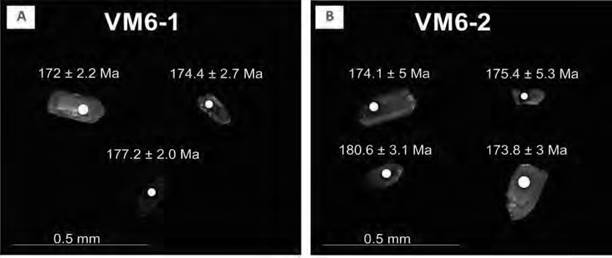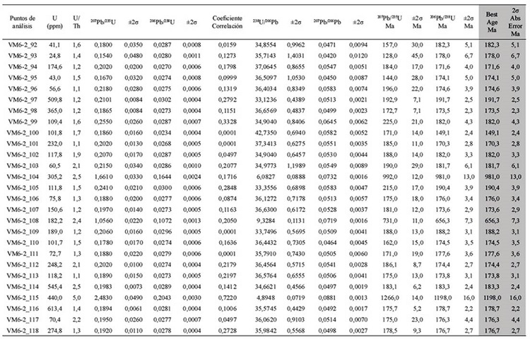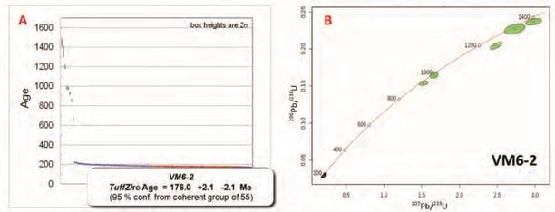 En la muestra VM6-2, correspondiente a un dique riolítico porfirítico (Figura 4C y 4D), se realizaron un total de 118 ablaciones (Anexo 2), cuyos datos fueron igualmente sometidos a los mismos tratamientos ya referidos anteriormente. La edad de cristalización obtenida para este cuerpo porfirítico, arrojó un valor de 176,0±2,1 Ma (2σ; ver Figura 7), el cual es muy cercano a la edad previamente reportada para el cuerpo plutónico antes referido (edad Toarciense).