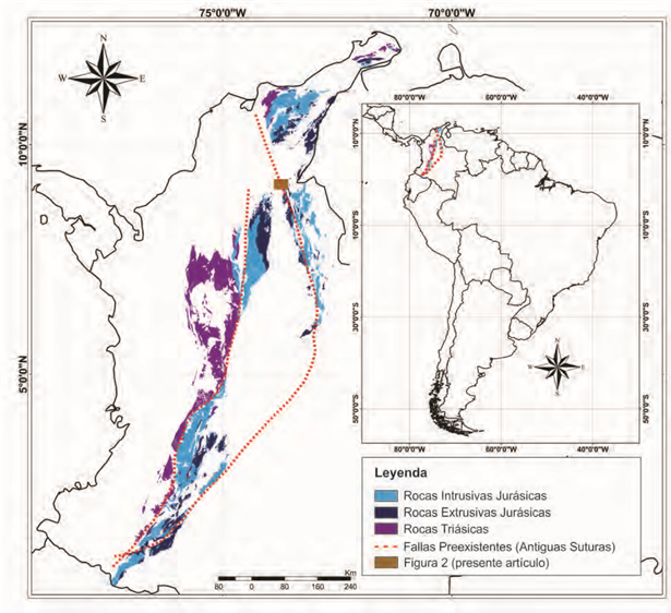 Los estudios geológicos de las rocas ígneas de edad Triásico-Jurásico aflorantes a lo largo de los Andes de Colombia (Figura 1), han identificado la presencia de por lo menos tres arcos magmáticos calco-alcalinos propios de ambientes de supra-subducción: (a) uno de aproximados 205-194 Ma (cuerpos ígneos del Macizo de Santander y Mocoa); (b) otro de aproximados 194174 Ma (cuerpos ígneos de la Sierra Nevada de Santa Marta, Norosí, San Martín, San Lucas, Ibagué Sur) y; (c) otro de aproximados 167-149 Ma (cuerpos ígneos de Segovia-Ibagué Norte; Leal-Mejía, 2011; Van der Lelij, 2013; Spikings et al., 2015). El emplazamiento de estos cuerpos se considera han sido controlados por fallas mayores y sistemas de sutura preexistentes, tales como las fallas de Palestina y Bucaramanga-Santa Marta-Suaza (Aspden et al., 1987; Cediel et al., 2003).