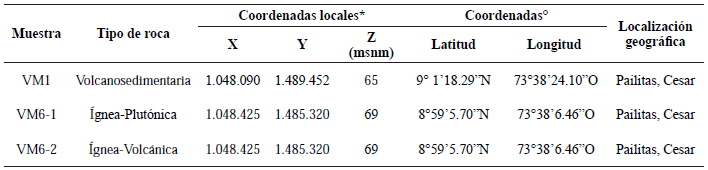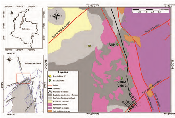 En el área del municipio de Pailitas (Figura 2), localizada entre las Cordilleras Oriental y Central de Colombia (inmediaciones al Macizo de Santander, al W de la falla de Bucaramanga, y la Serranía de San Lucas, al E de la falla de Palestina), afloran rocas ígneas (plutónicas, hipoabisales, volcanoclásticas y volcanosedimentarias), las cuales no han sido datadas por métodos absolutos, pero a las cuales se les asignó por extrapolación una edad Jurásico (INGEOMINASUIS, 2006a).