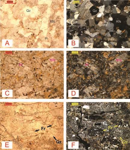 Para fines de explorar la petrografía de las rocas mayoritarias que afloran en el área de estudio, se colectaron tres muestras al norte del municipio de Pailitas (departamento del Cesar; ver Figura 2; dos muestras de cuerpos ígneos félsicos VM6-1 y VM62 y una de un cuerpo volcanosedimentario). La muestra VM6-1 clasificada como un sienogranito según Streckeisen (1979) con textura fanerítica y con evidencias locales de alteraciones hidrotermales hipógenas y supérgenas; es holocristalino, con cristales mayoritariamente subhedrales, algunos de ellos de 1 a 2 mm, compuestos principalmente de feldespato potásico (38%), plagioclasa (15%) (estos dos últimos alterados a sericita), cuarzo (45%) y con minerales accesorio de biotita y opacos (Figura 4A y 4B). La muestra VM6-2 (Figura 4C y 4D) corresponde a un dique riolítico que intruye al cuerpo granítico ya referido. Esta roca presenta una textura porfiriticaafanítica, cuyos fenocristales y microfenocristales se componen principalmente por plagioclasa (20%), feldespato potásico (36%) (altamente sericitizados) y cuarzo (41%) (en menor proporción cristales de biotita y minerales secundarios de clorita y epidota). La muestra de roca volcanosedimentaria (muestra VM1) corresponde a una toba lítica (Figura 4E y 4F), con texturas microporfídica y fragmetal, compuesta principalmente por microcristales de cuarzo, feldespato potásico, plagioclasa y fragmentos líticos inmersos en una matriz microcristalina a vítrea. Los fragmentos líticos son principalmente juveniles de tobas.