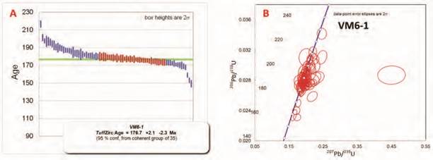 Las edades de cristalización de los circones ígneos de los cuerpos plutónicos (edades U-Pb en circones de 176,7±2,2 Ma), hipoabisales (edades U-Pb en circones de 176,0±2,1 Ma), y la máxima edad estratigráfica (o máxima edad de depositación) de las rocas