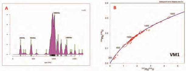 En la muestra VM1, correspondiente a una toba lítica (VM1), se hicieron un total de 146 análisis en circones detríticos (Anexo 3) (Figura 8). Basados en las edades U-Pb obtenidas, es posible determinar que la máxima edad estratigráfica es de 191,2±1,8 Ma, correspondiente al Sinemuriense (Jurásico Temprano). La presencia de otros circones detríticos con picos de edades del Neo- y Meso- Proterozoico (577,7±5,5 Ma y 1564±15 Ma) (Figura 8A) indican una procedencia de rocas más antiguas, como por ejemplo las unidades Gneis de Bucaramanga y Esquistos del Silgará (Mantilla-Figueroa et al., 2016).En cuanto a los picos de edades paleozoicas que oscilan entre 255,5±2,1 Ma y 459,6±4,7 Ma, se considera su relación con los eventos magmáticos ocurridos durante esta era (Cardona et al., 2016).