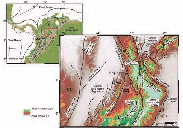 Hacia el norte de la CO la configuración estructural está principalmente dominada por la Falla de Bucaramanga (Figuras 1 y 2), estructura que según Cediel et al. (2003) fue reactivada en el Aptiano-Albiano, debido a la migración del bloque Maracaibo en dirección NW, en el cual la falla constituiría el límite occidental del mismo. La actividad tectónica de las fallas mayores como Bucaramanga, Soapaga y FRS (Figura 1) a lo largo de los bordes de los macizos de Santander y Floresta daría lugar a la actual configuración del núcleo de la CO (Tesón et al., 2013; Velandia, 2017).
