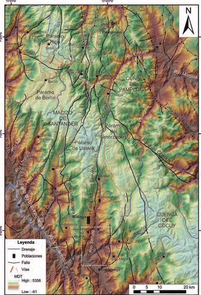 El presente estudio se realiza al NE de la Cordillera Oriental de Colombia (CO), en la zona sur del río Servitá hasta su desembocadura en el río Chicamocha, donde el Macizo de Santander se adelgaza para continuar al sur como Macizo de Floresta (Velandia, 2017; Figura 1). En el área se presenta el límite SE del Macizo de Santander con la cuenca del Cocuy (Fabre, 1983), definido por el trazo de la Falla Río Servitá (FRS), estructura longitudinal S-N de tipo inverso y vergencia al E que ha sido interpretada como una falla profunda de alto ángulo que se desprende de la falla de rumbo de Bucaramanga (Corredor, 2003; Velandia, 2017). La FRS se puede correlacionar en su evolución geológica con la Falla de Soapaga al sur, y las fallas de Mutiscua (Figuras 1 y 2) y Las Mercedes al norte (Velandia, 2017). Esta estructura parece dominar la deformación en el área a través de fallas menores de cabalgamiento en su bloque yacente, sin embargo, también se destacan estructuras transversales con orientaciones al NE y NW, algunas relacionadas con la Falla de Bucaramanga. Esta configuración geométrica de la zona genera interés estructural y tectónico para comprender la evolución de esta parte de la CO.