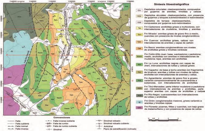 La cartografía geológica existente de la zona de estudio (Vargas et al., 1976; Cardozo et al., 2016a, 2016b) se complementó a partir de fotointerpretación de imágenes satelitales y trabajo de campo, especialmente para la revisión litológica y estructural del área. Esta labor permitió retirar o filtrar algunos lineamientos de la cartografía regional, así como redefinir los trazos que en efecto corresponden con fallas geológicas. Se reconoció la vergencia de las estructuras plegadas y falladas según su geometría y el desplazamiento en distintos sectores del área de trabajo. Los estilos estructurales identificados en el área se plasman en tres perfiles transversales generados a partir del mapa geológico.