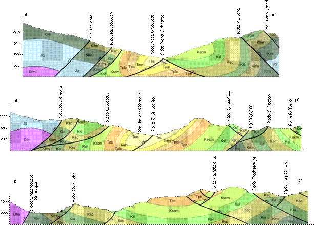 El estilo de piel gruesa también está representado al suroccidente de la zona por la Falla Chicamocha - Soapaga, (Figuras 3 y 4), mientras que, hacia el oriente del área las fallas de cabalgamiento muestran una vergencia principal al W, con retrocabalgamientos asociados, cuya interacción define una serie de estructuras en pop-up (Figuras 3 y 4C).