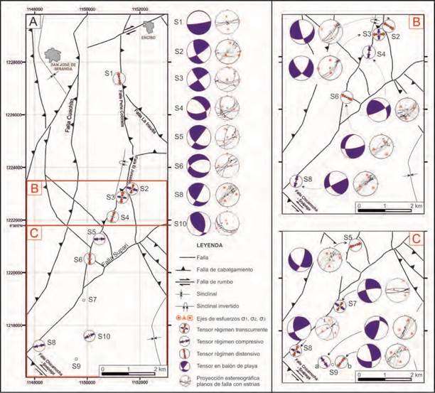 Tensor SE-NW: este se observa en rumbo puro (S7 y S8) con soluciones de fallas que corresponden con las estructuras cartografiadas con orientación W-E y NW (Figura 5C). También aparece en regímenes de extensión (S5 y S9b) y compresión oblicua (S9a), estos tensores muestran igualmente relación con las fallas regionales de tendencia NE.