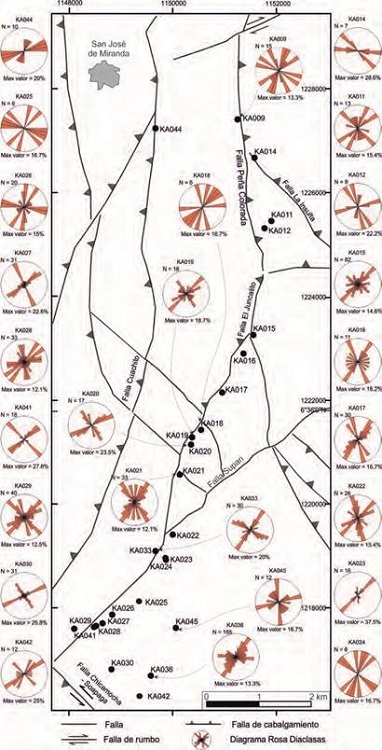 En todas las estaciones, con excepción de KA-014, la orientación predominante de las diaclasas es NE (Figura 6), paralela al trazo de la principal falla transversal de la zona (Falla Supari), aunque, en algunas estaciones cercanas a la Falla El Juncalito se presentan familias de diaclasas con orientación un poco más al norte (NNW-SSE), paralelas a esta falla de cabalgamiento (KA-016, KA-017; Figura 6).