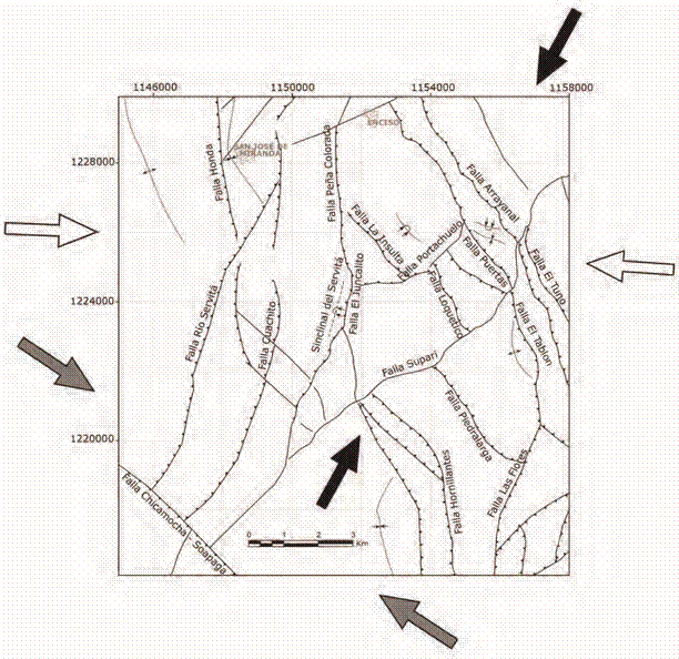 La deformación también es acomodada a través de fallas transversales SW-NE (fallas Portachuelo y Supari) y SE-NW (fallas Portalarga, La Insulta, El Tablón), que limitan en ocasiones secuencias litológicas con buzamientos contrarios (Falla Portachuelo; Figura 3), así mismo, la deformación es propagada por medio de pliegues asimétricos que se desarrollan paralelos al trazo de las fallas, con ejes principalmente NW-SE (Figura 3), y por fallas que cortan longitudinalmente los pliegues hacia el núcleo (Falla El Juncalito; Figura 4B), estas últimas constituyen estructuras secundarias de acomodación de pliegue o fallas inversas fuera del sinclinal, como las explicadas por (Mitra 2002).