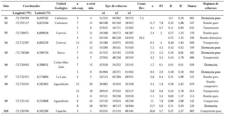 Los tensores de esfuerzos resultantes se separan en tres grupos según su orientación. En la mayoría de estaciones (70%) se consiguieron al menos dos direcciones de tensores de esfuerzos, con excepción de S1, S7 y S10, donde sólo se obtuvo un tensor debido a la baja cantidad de datos medidos, y en S8 donde se tiene la mayor cantidad de planos estriados (30), resultando en tres tensores de esfuerzos (Tabla 1). Del total de 148 de planos estriados medidos, se usaron 121 para la obtención de los tensores, es decir, que el 18% de los datos se descartaron por no presentar coherencia mecánica con los subconjuntos definidos por el programa. Esta coherencia fue determinada a partir de la distribución de los datos en el círculo de Mohr, en el que son procesados los planos ubicados en el campo de fallas neoformadas (a lo largo de la envolvente de Mohr-Coulomb) o reactivadas, evitando datos del campo estable, que pueden corresponder a tensores diferentes y probablemente más antiguos (Velandia, 2017). Se aclara que un mismo tensor de esfuerzos puede resultar con varios regímenes según el tipo de estructuras que se mida, por ejemplo, en una estación de campo pueden coexistir fallas de rumbo, que darán un régimen transcurrente (rumbo), con fallas normales o inversas de donde resultarán regímenes de distensión o compresión, respectivamente.