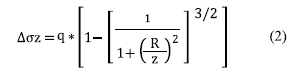 La expresión empleada permite encontrar el incremento de esfuerzo vertical (Δσz) para cualquier punto debajo del centro de una carga circular de radio R, sometida a una presión de contacto (q) uniformemente distribuida, y para una profundidad (Z) de interés cualquiera (Ecuación 2).