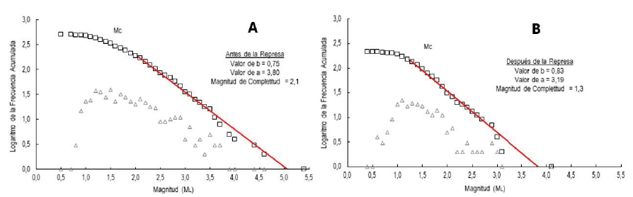 Para la represa de Topocoro, es posible comparar el parámetro “b” antes y después de su entrada en operación. Aunque en ambos casos el valor de “b” es menor a 1,0, existe un leve incremento de este parámetro después de construir la represa e iniciar el proceso de sobrecarga hidrostática, es decir, una leve tendencia a la ocurrencia de eventos de menor magnitud (Figura 8).