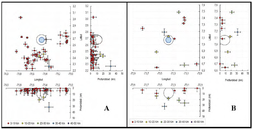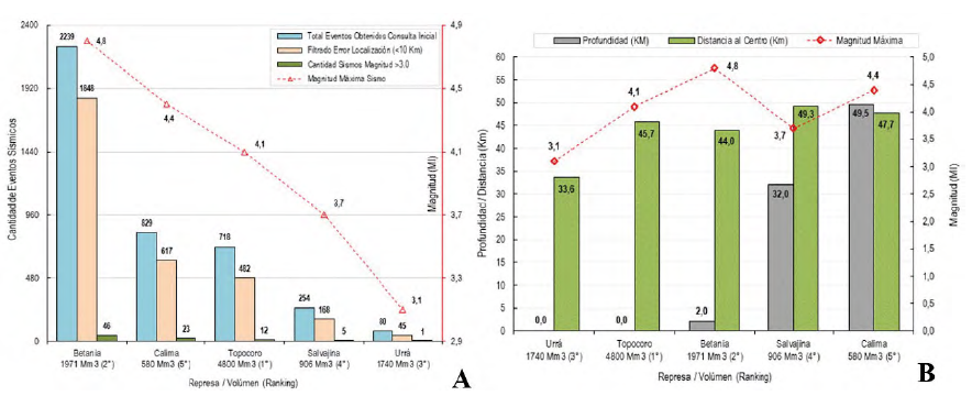 Los umbrales de consulta en área y profundidad definidos en la investigación para la determinación de los eventos sísmicos de interés en los alrededores de cada represa son superiores en relación con otros estudios realizados a nivel mundial. Por ejemplo, para el embalse Song Trank 2 (Vietnam) se delimitó el análisis a un radio de 30 km (Lizurek et al., 2017); mientras que otros investigadores han optado por realizar sus análisis dentro de límites inferiores a los 20 km (Drakatos et al., 1998; Mikhailov et al., 2017; Stiros y Pytharouli, 2018).